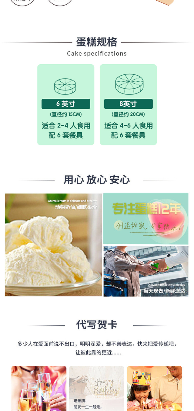 提供慢必赔服务保障,同城生日蛋糕商品订单若晚到1小时,此单无条件退款,此蛋糕免费赠送。(恶劣天气等外部不可控因素导致配送延迟情形除外)