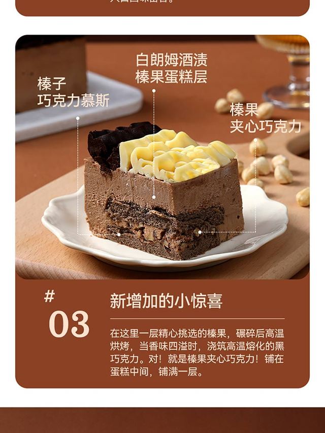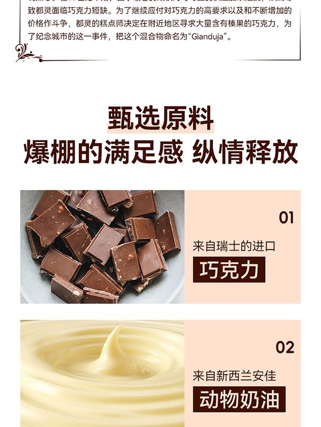 产品口味:巧克力榛子主要原料:黑巧克力(瑞士)、白巧克力(瑞士)、淡奶(新西兰)、榛子酱、烘烤榛仁、...更多