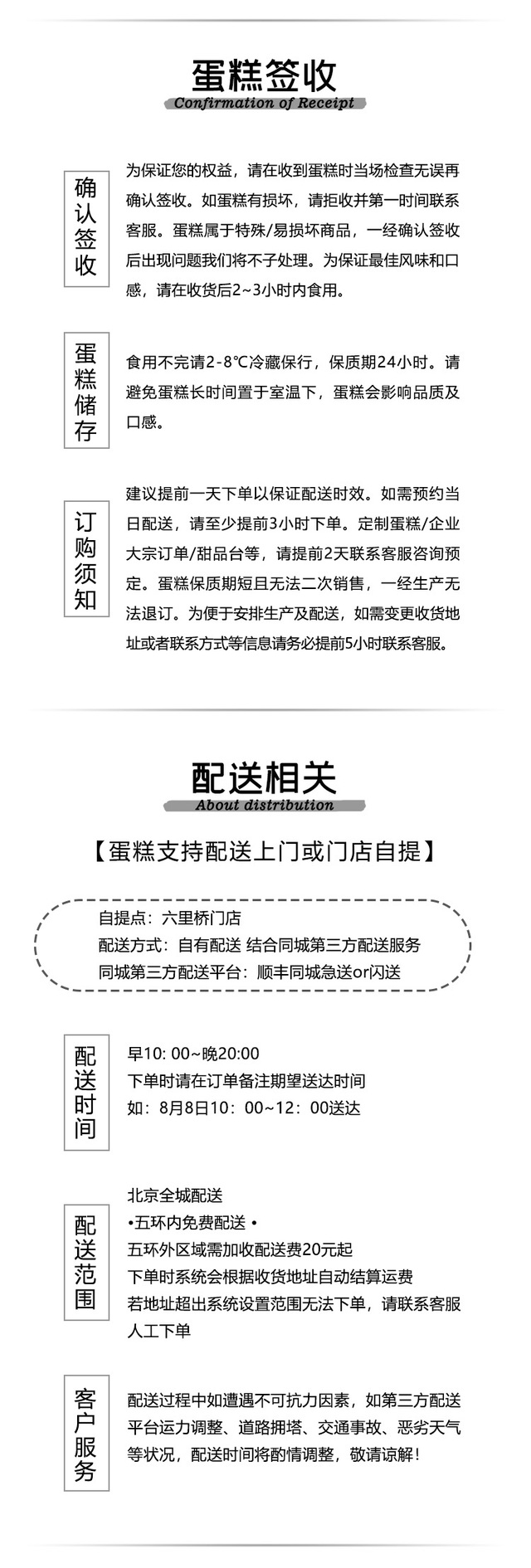 提供慢必赔服务保障,同城生日蛋糕商品订单若晚到1小时,此单无条件退款,此蛋糕免费赠送。(恶劣天气等外部不可控因素导致配送延迟情形除外)