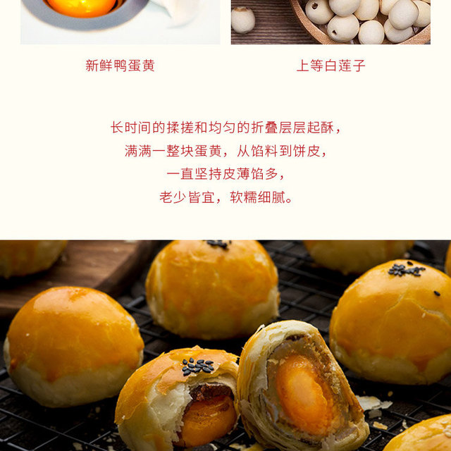 严选好食材,配以传统手艺,精心烘焙而成。外皮层层叠叠,一口咬下去酥得掉渣,咸蛋黄的油润咸香与莲蓉的甜...更多