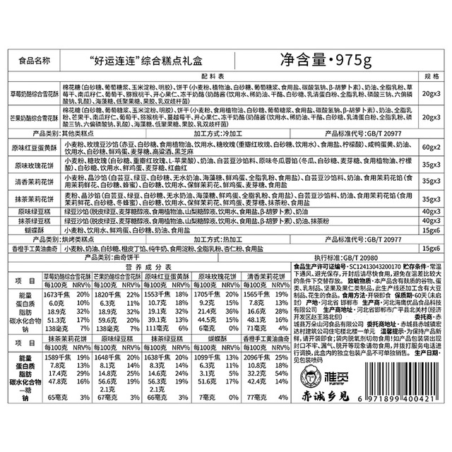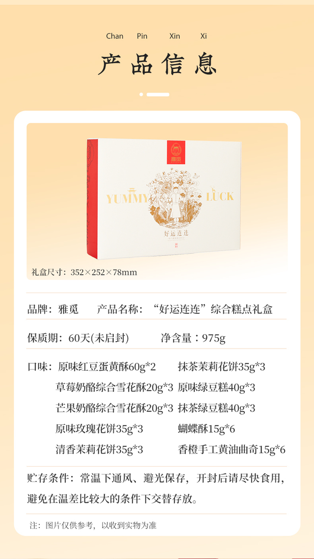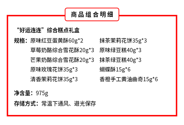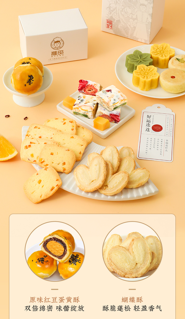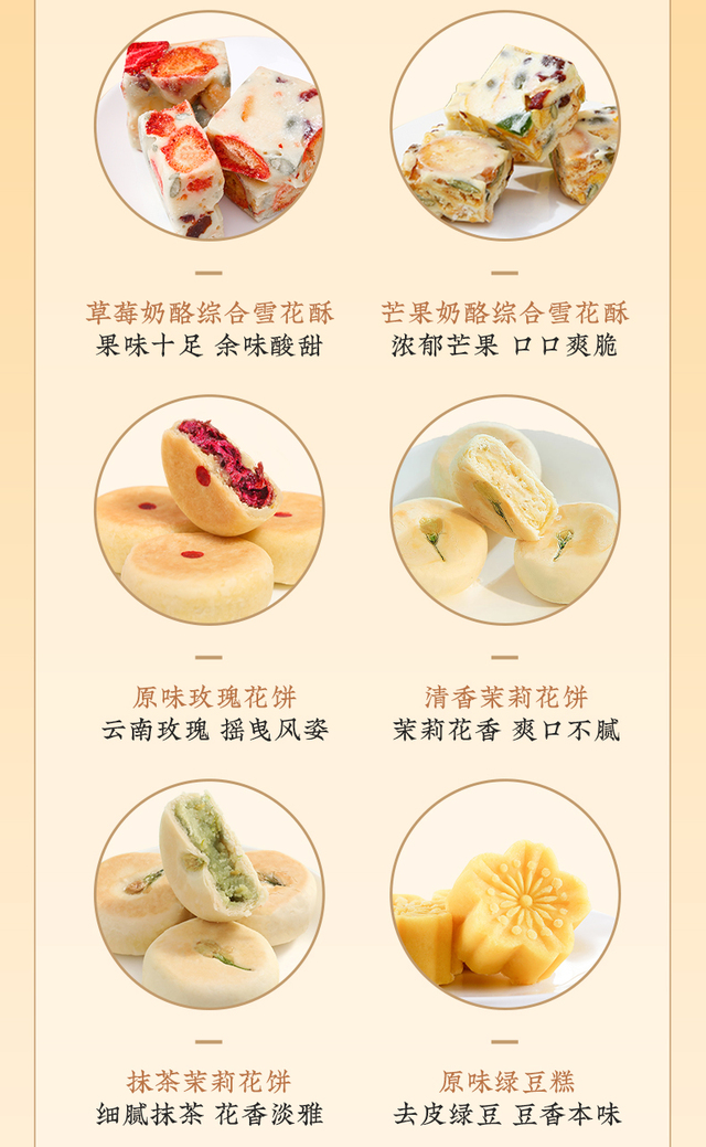 原味红豆蛋黄酥60g,草莓综合雪花酥20g,芒果综合雪花酥20g,原味玫瑰花饼35g,清香茉莉花饼3...更多