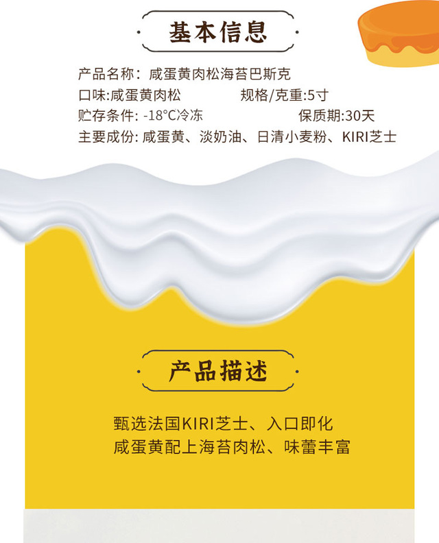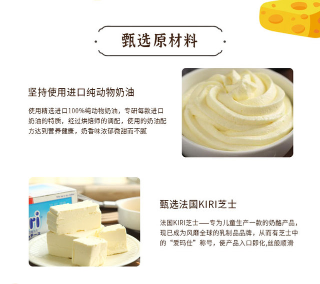 甄选法国KIRI芝士、入口即化、咸蛋黄配上海苔肉松、味蕾丰富,包装随机发货