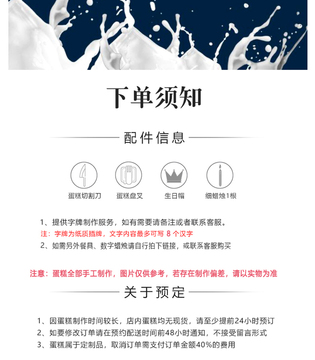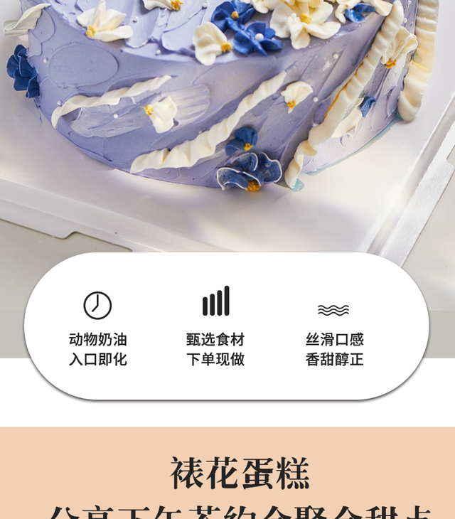 提供慢必赔服务保障,同城生日蛋糕商品订单若晚到1小时,此单无条件退款,此蛋糕免费赠送。(恶劣天气等外部不可控因素导致配送延迟情形除外)