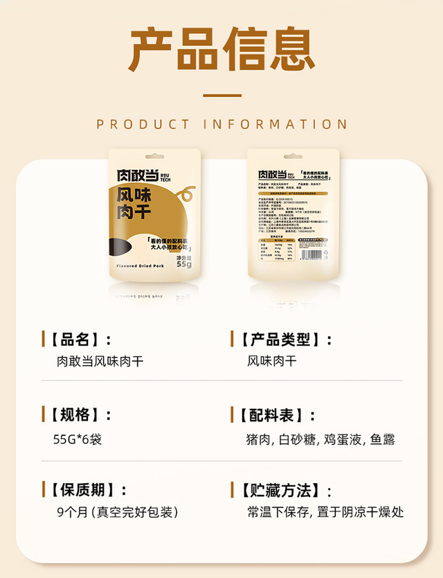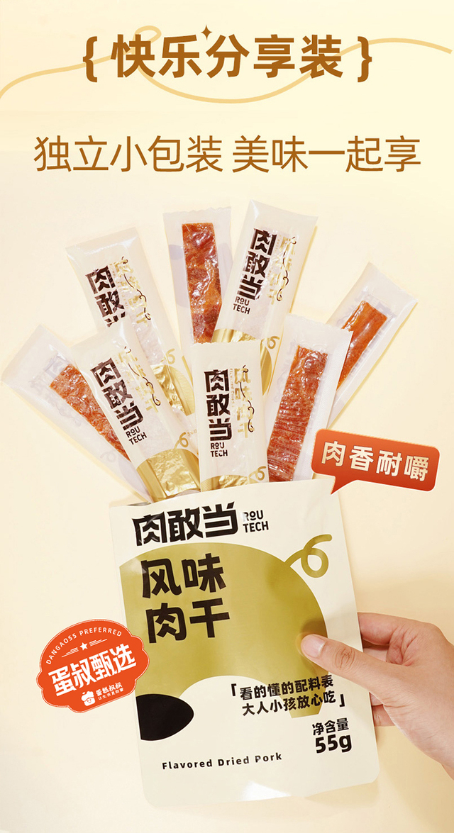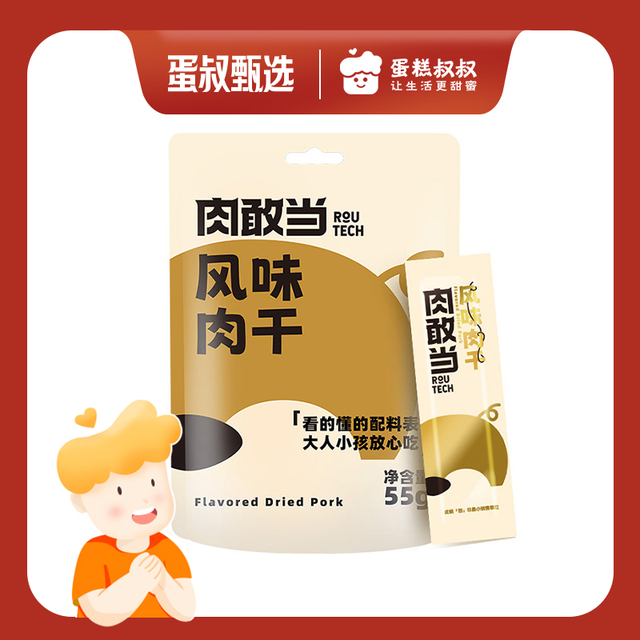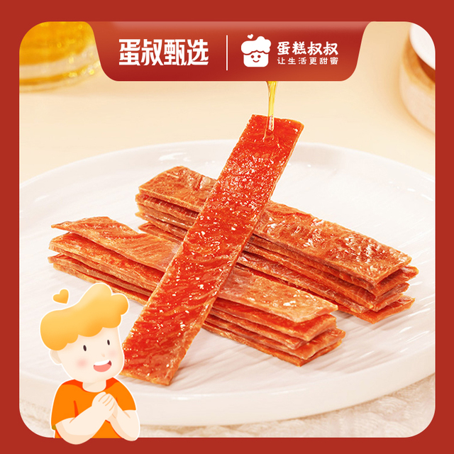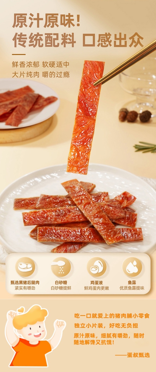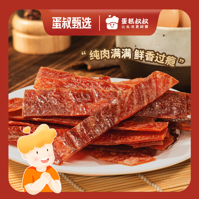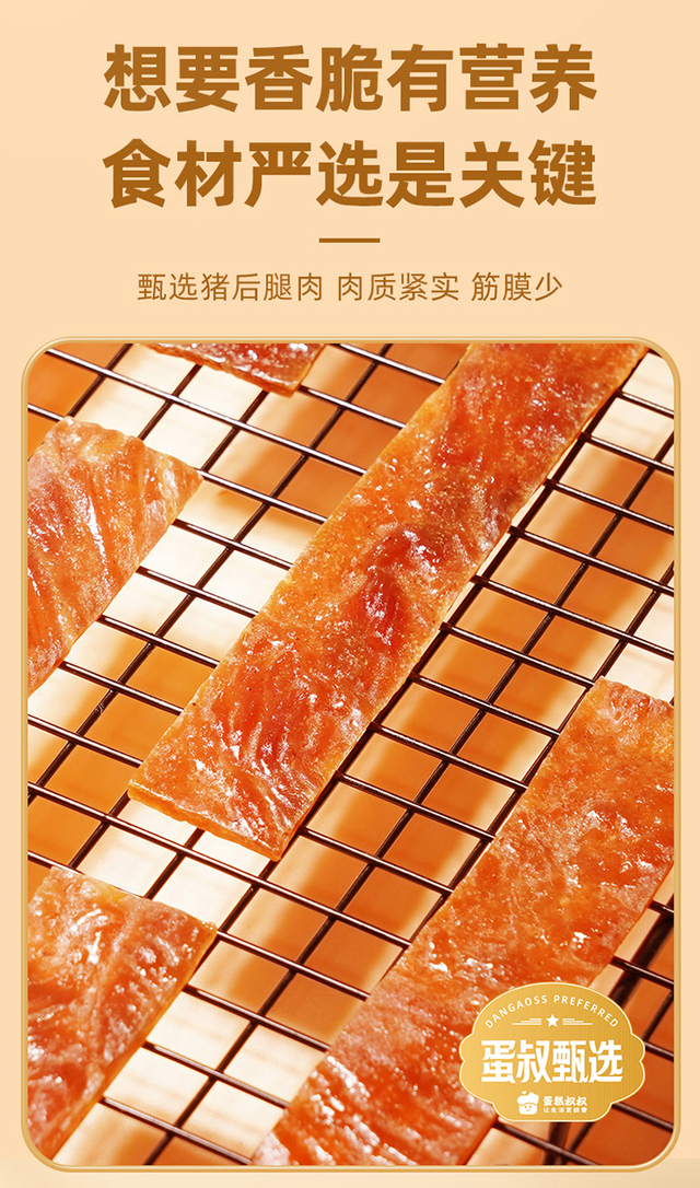 快递完整(蛋叔甄选的东西快递包装每一个都很谨慎)日期新鲜,配料表干净只有猪肉,白砂糖,鸡蛋液和鱼露四样。对比某江品牌猪肉脯,蛋白质含量高很多,不含大豆组织蛋白蛋白,真的很推荐这种符合食品要求的零食!