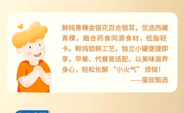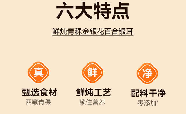 西藏青稞;添加金银花;添加低聚果糖,不添加蔗糖;高温灭菌、安全锁鲜、小火气不发愁