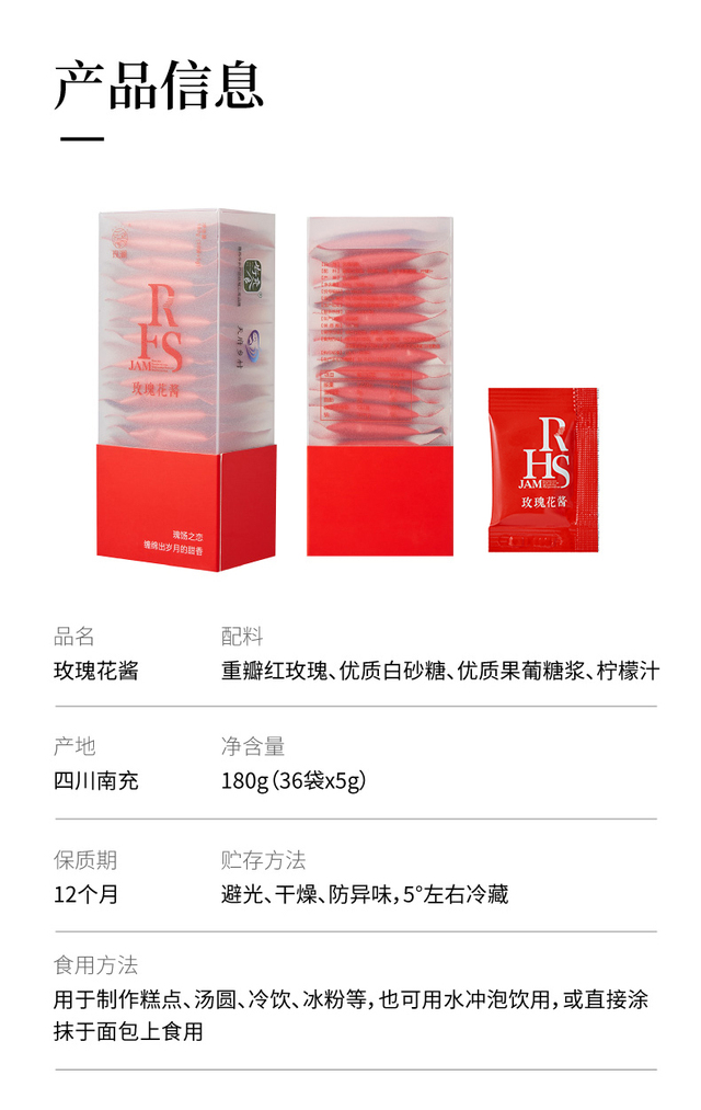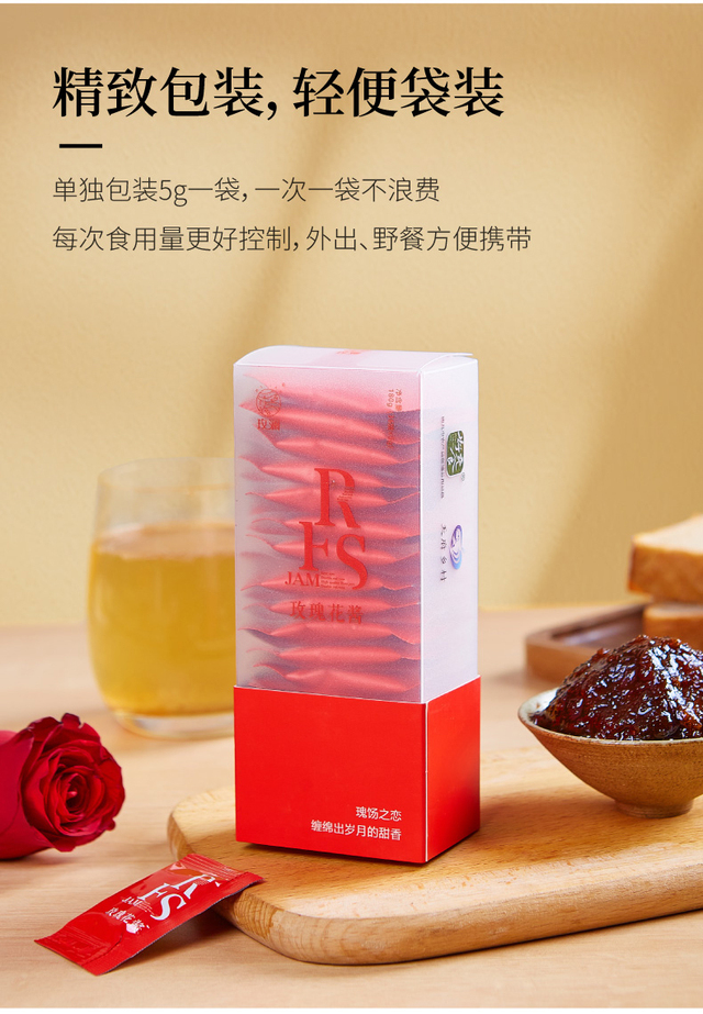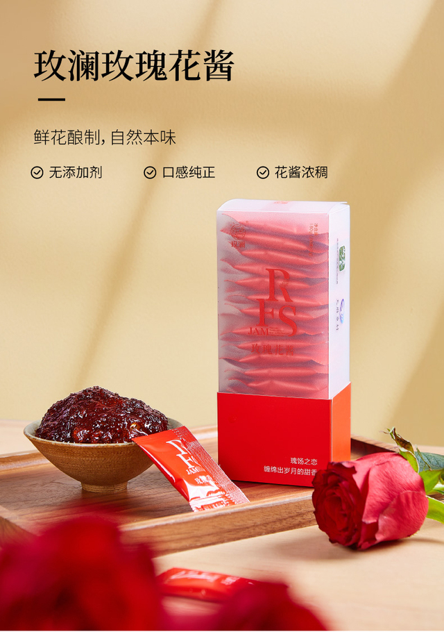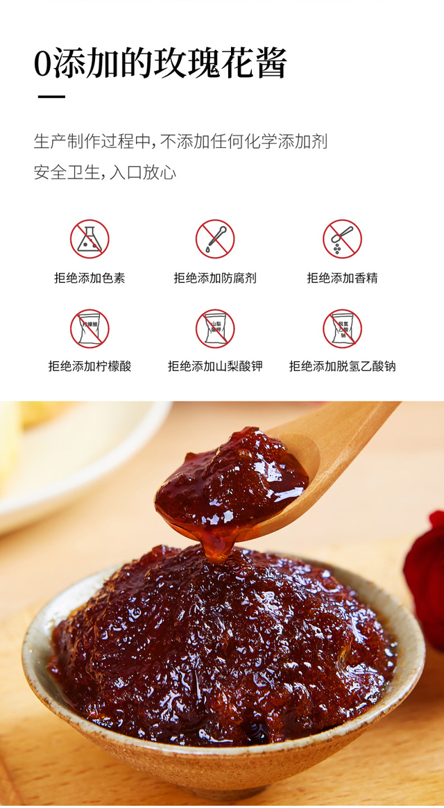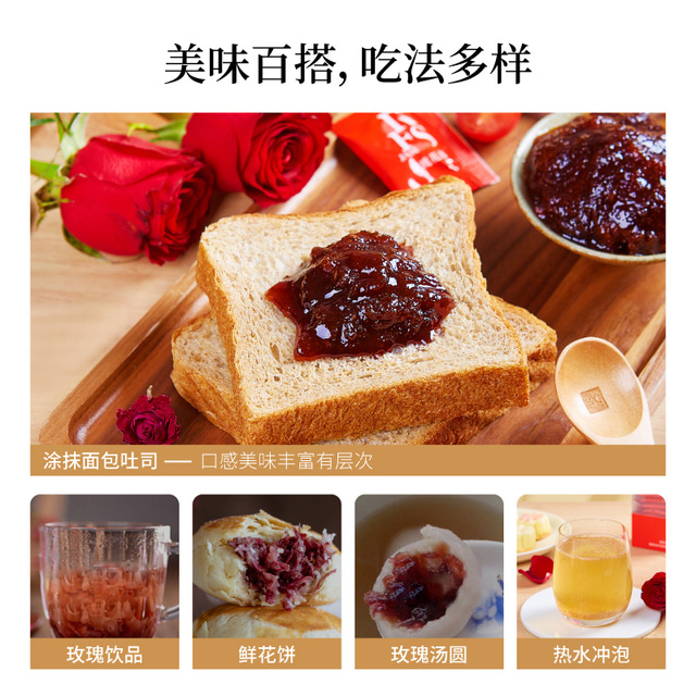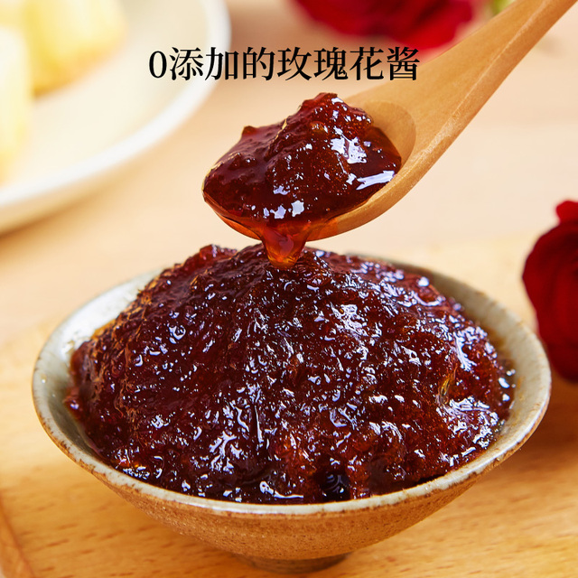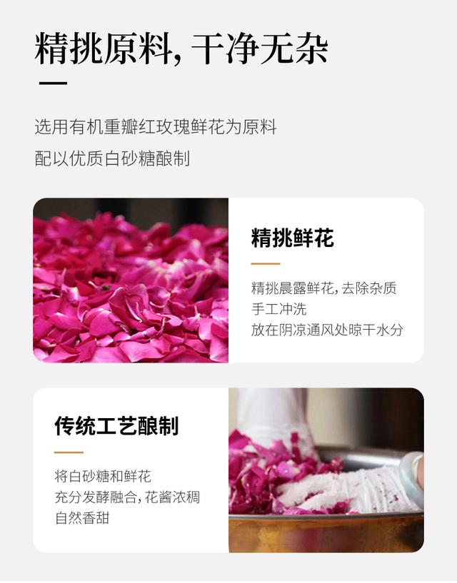 选用有机重瓣红玫瑰、优质白糖手工酿制、无添加剂、口感纯正、香甜不腻、独立小包装方便携带