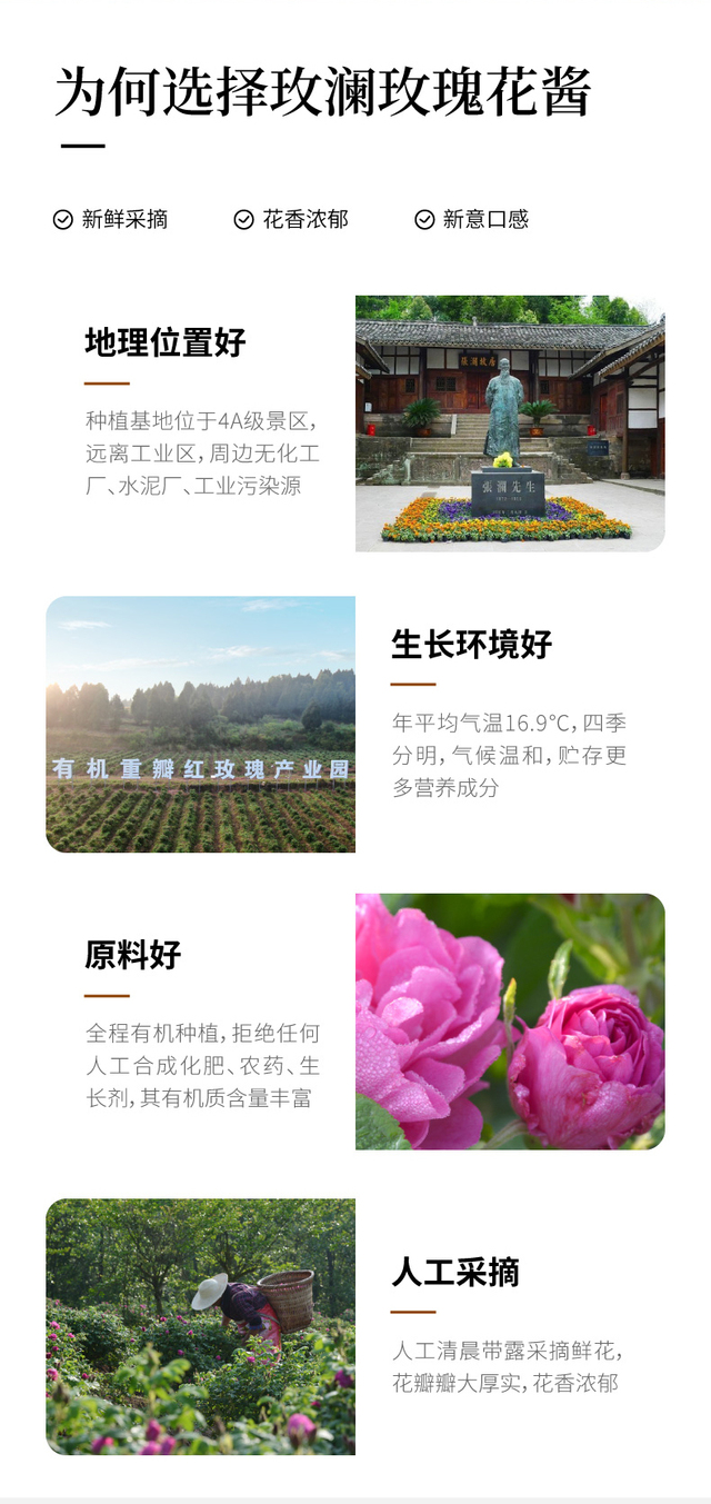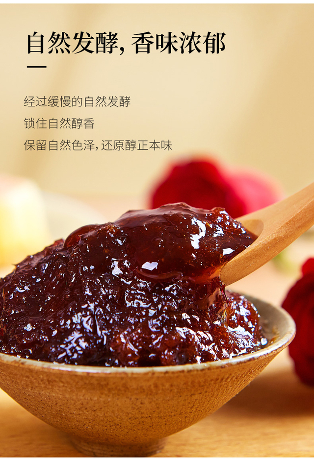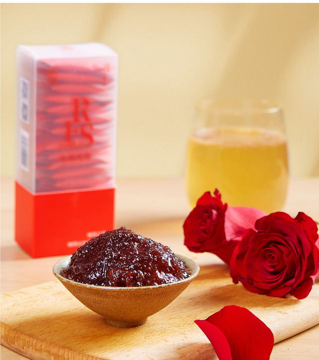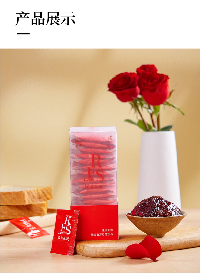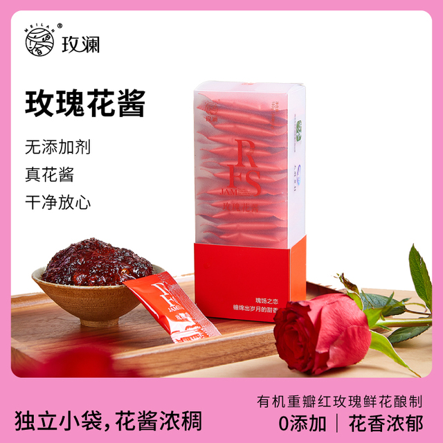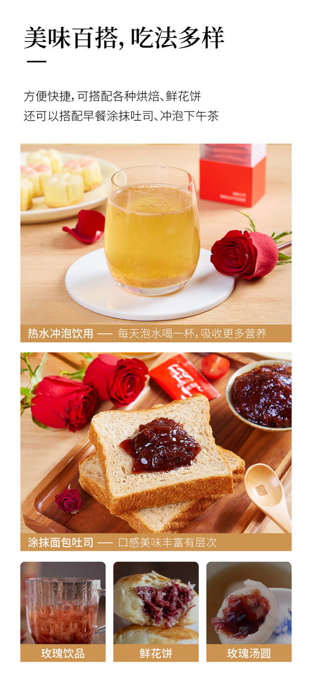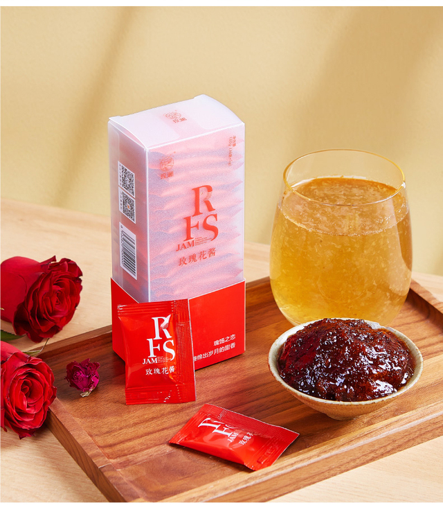 选用有机重瓣红玫瑰、优质白糖手工酿制、无添加剂、口感纯正、香甜不腻、独立小包装方便携带