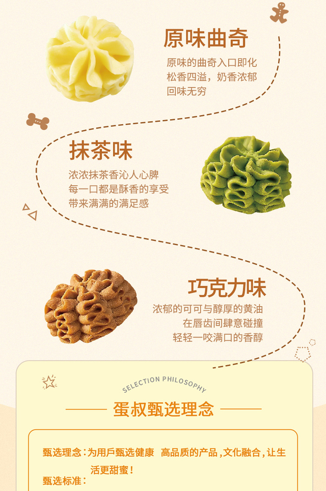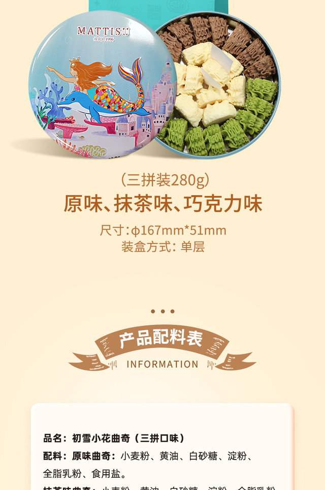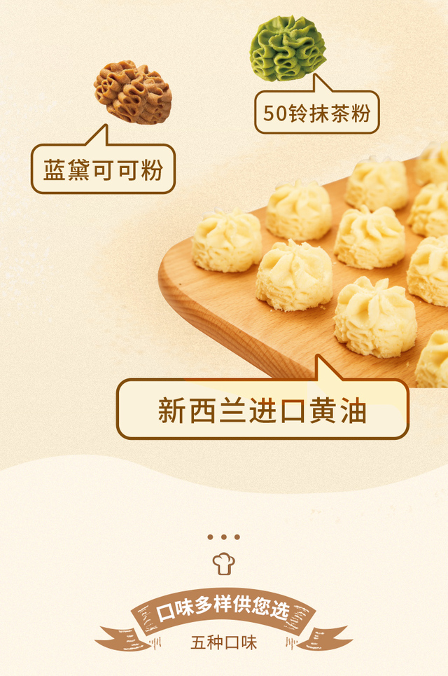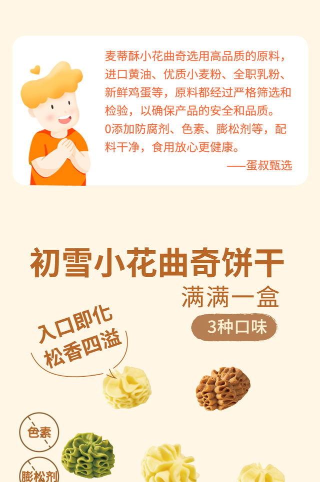 麦蒂酥小花曲奇选用高品质的原料,进口黄油、优质小麦粉、全脂乳粉、新鲜鸡蛋等,这些原料都经过严格筛选和...更多