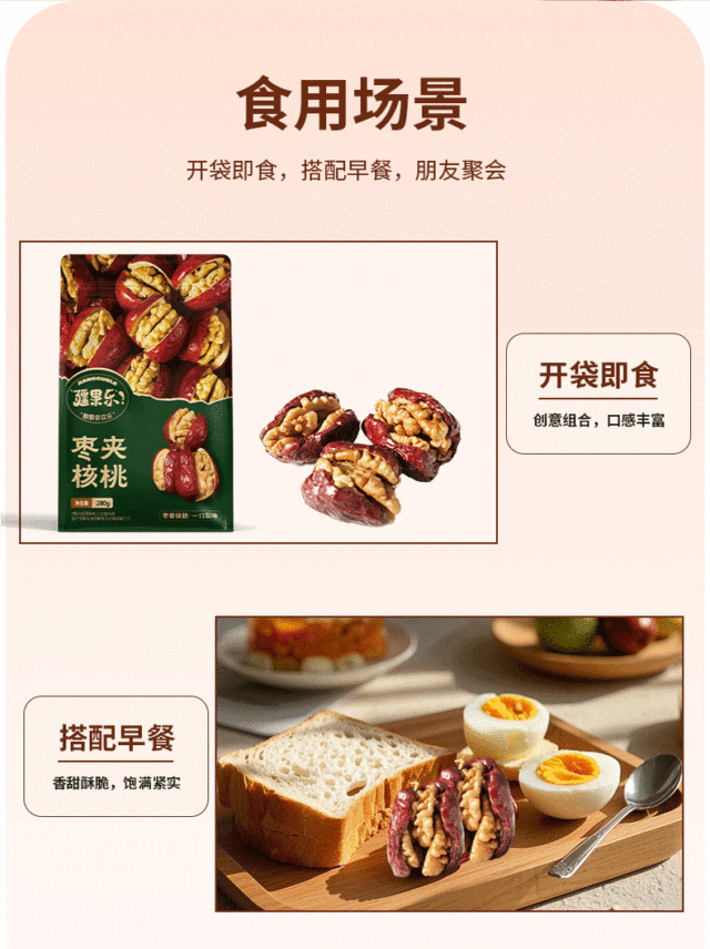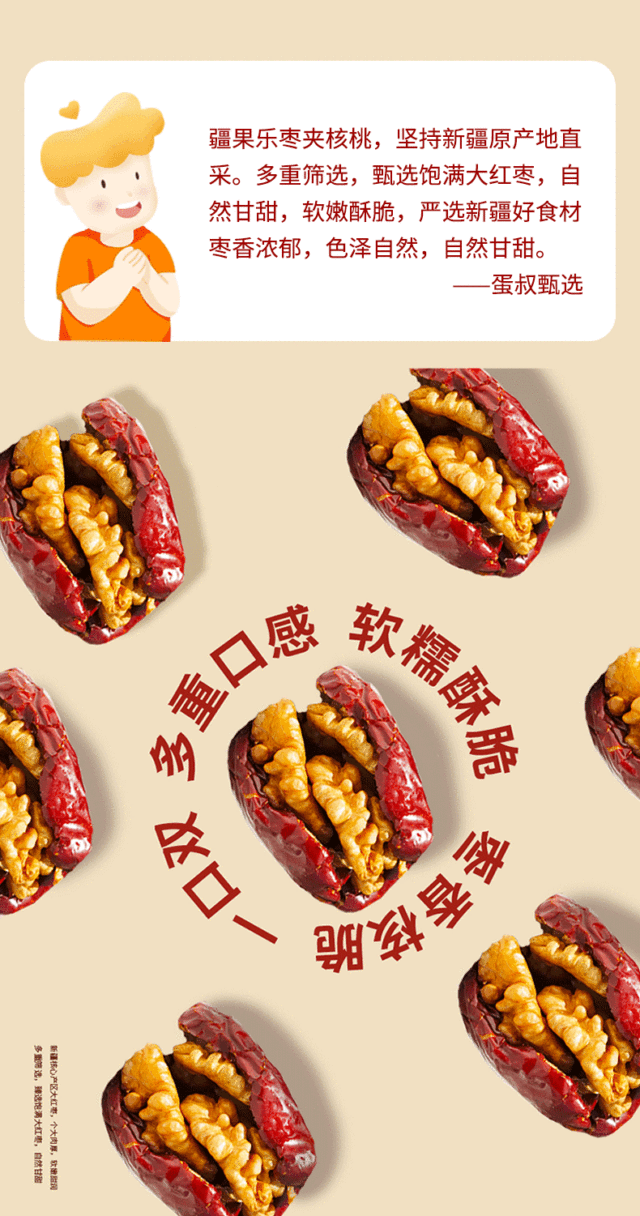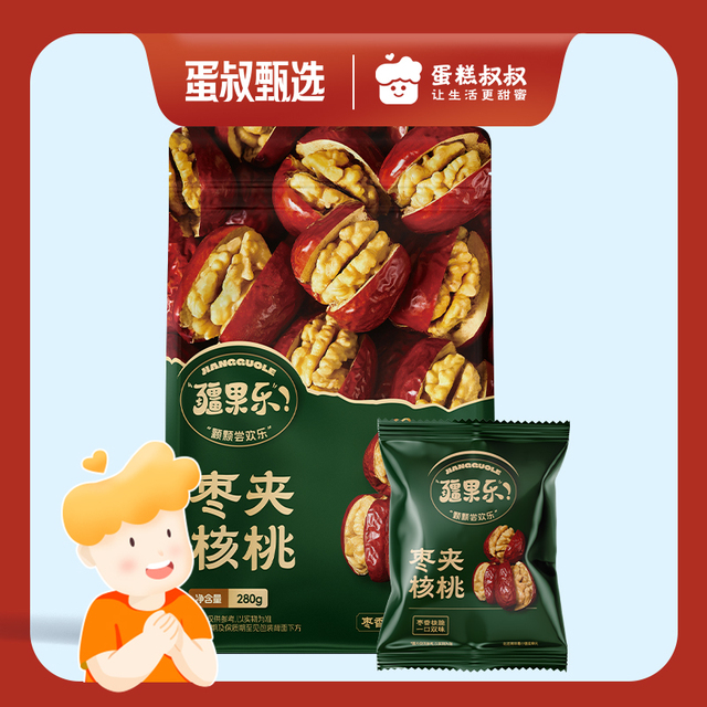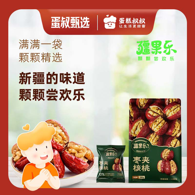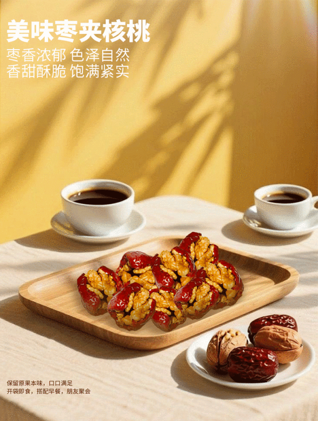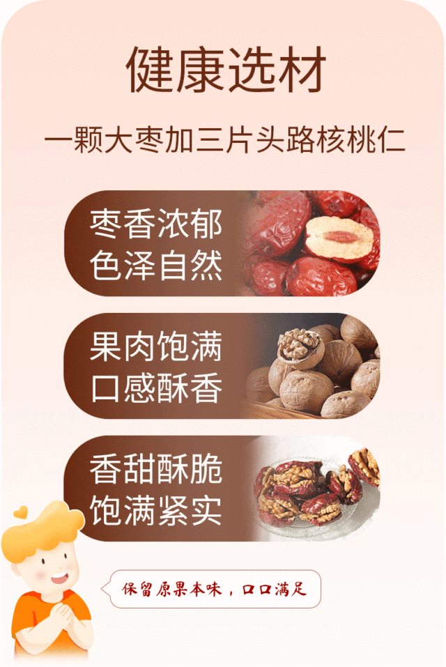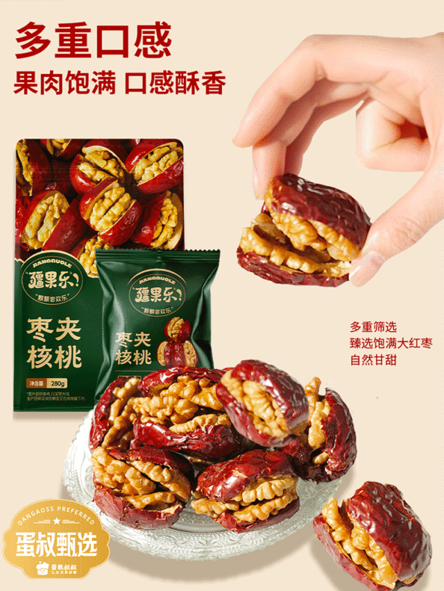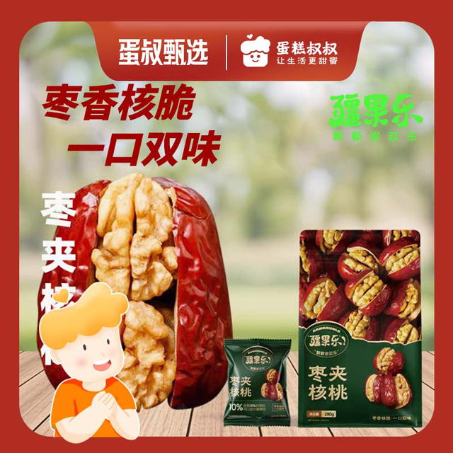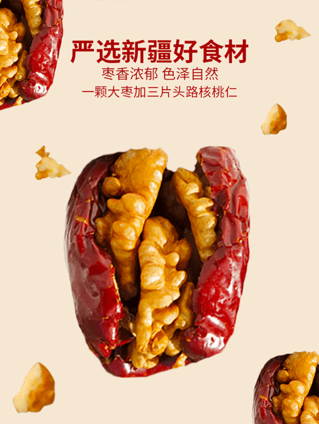 枣夹核桃臻选厚实枣肉,新鲜核桃仁,将红枣的甜糯与核桃的香酥完美融合,美味升级,营养多样,诱人的色泽,...更多