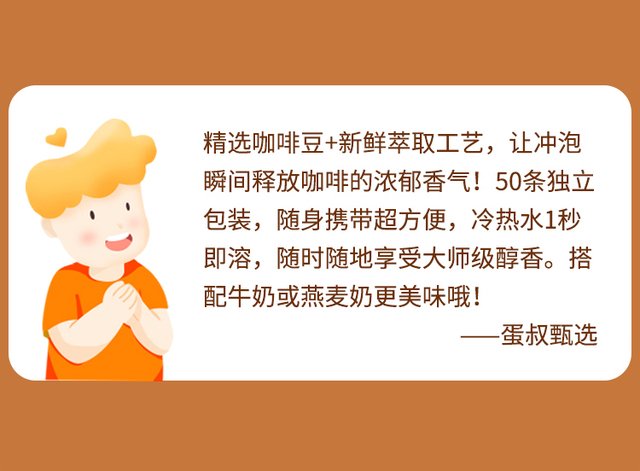 精选咖啡豆+新鲜萃取工艺,让冲泡瞬间释放咖啡的浓郁香气!50条独立包装,随身携带超方便,冷热水1秒即...更多