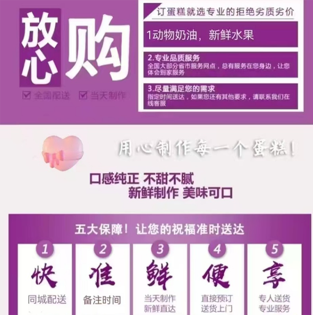提供慢必赔服务保障,同城生日蛋糕商品订单若晚到1小时,此单无条件退款,此蛋糕免费赠送。(恶劣天气等外部不可控因素导致配送延迟情形除外)